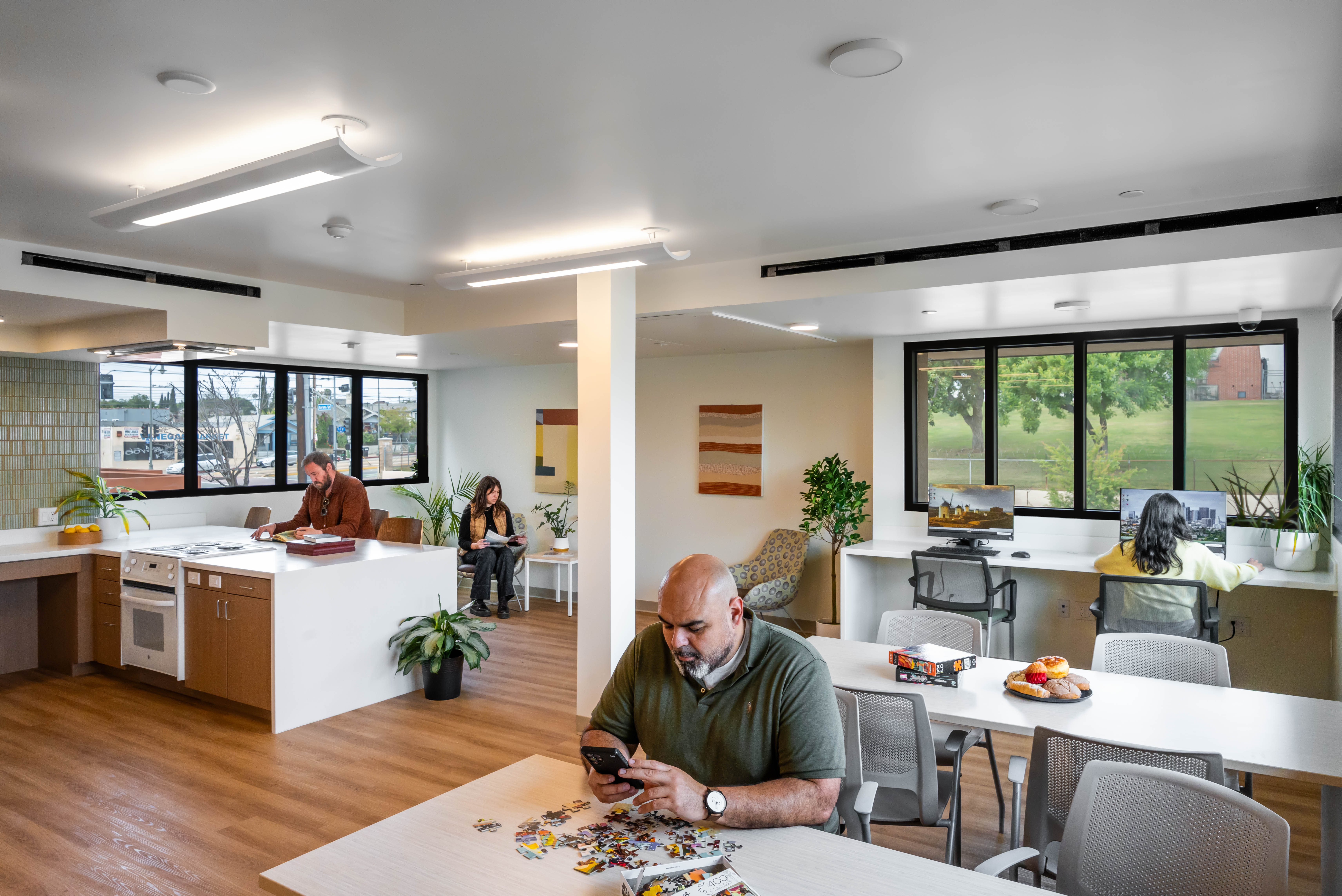 Lorena Plaza is a dynamic mixed-use development that combines 49 affordable housing units with 7,500 sq. ft. of retail space. The residential component includes a mix of 3 studio units, 18 one- bedroom units, 20 two-bedroom units, and 8 three-bedroom units. The development features a range of amenities designed to foster community engagement and support tenants’ needs, including a community room with a television and lounge area, a community kitchen, laundry facilities, library, a computer room, a gym, and a landscaped outdoor courtyard. o42 architecture’s interior design team provided furnishings and fixtures for each residential unit as well as the offices, courtyard and community spaces on the property.