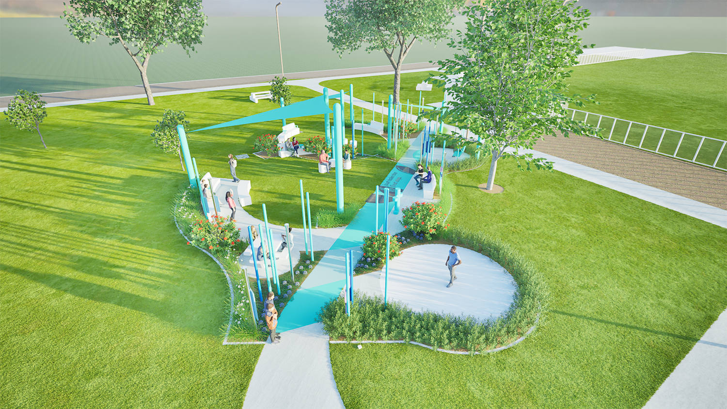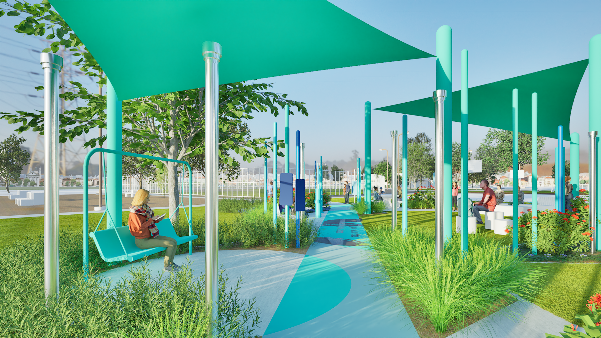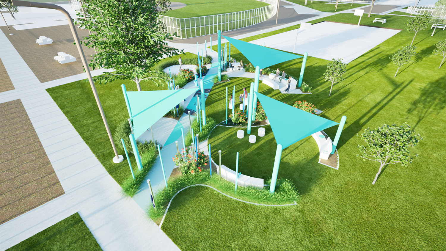 office42 architecture is in the process of the design and development of Well-being Spaces - an outdoor area designed to encourage social interaction and mental wellness. It uses curved benches, planted areas, and colored steel posts to define a series of larger and smaller gathering spaces linked by accessible pathways. Key features include: shade sails, a new large specimen tree, wellness signage, a bench swing, a hydration station, and misters. The Our SPOT Teen Lounges are outdoor spaces for teens, adjacent to their indoor meeting area. They feature a new fence for security and privacy, as well as wellness signage, improved safety lighting, new decorative lighting, colorful concrete stain, synthetic turf “carpeting”, outdoor furnishings, and potted plants.